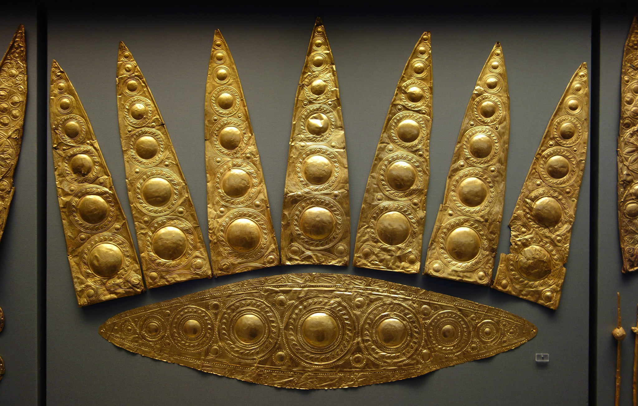 Celebrated artefacts from Mycenae include five magnificent beaten gold burial masks (one being incorrectly attributed to Agamemnon by Schliemann), gold diadems, carved rings, cups and a lion head rhyton. A magnificent bronze and gold rhyton in the form of a bull's head, large bronze swords and daggers with richly inlaid scenes on their blades, ivory sculpture and fragments of fresco also give testimony to the quality of craftsmanship and wealth of 'golden Mycenae' .