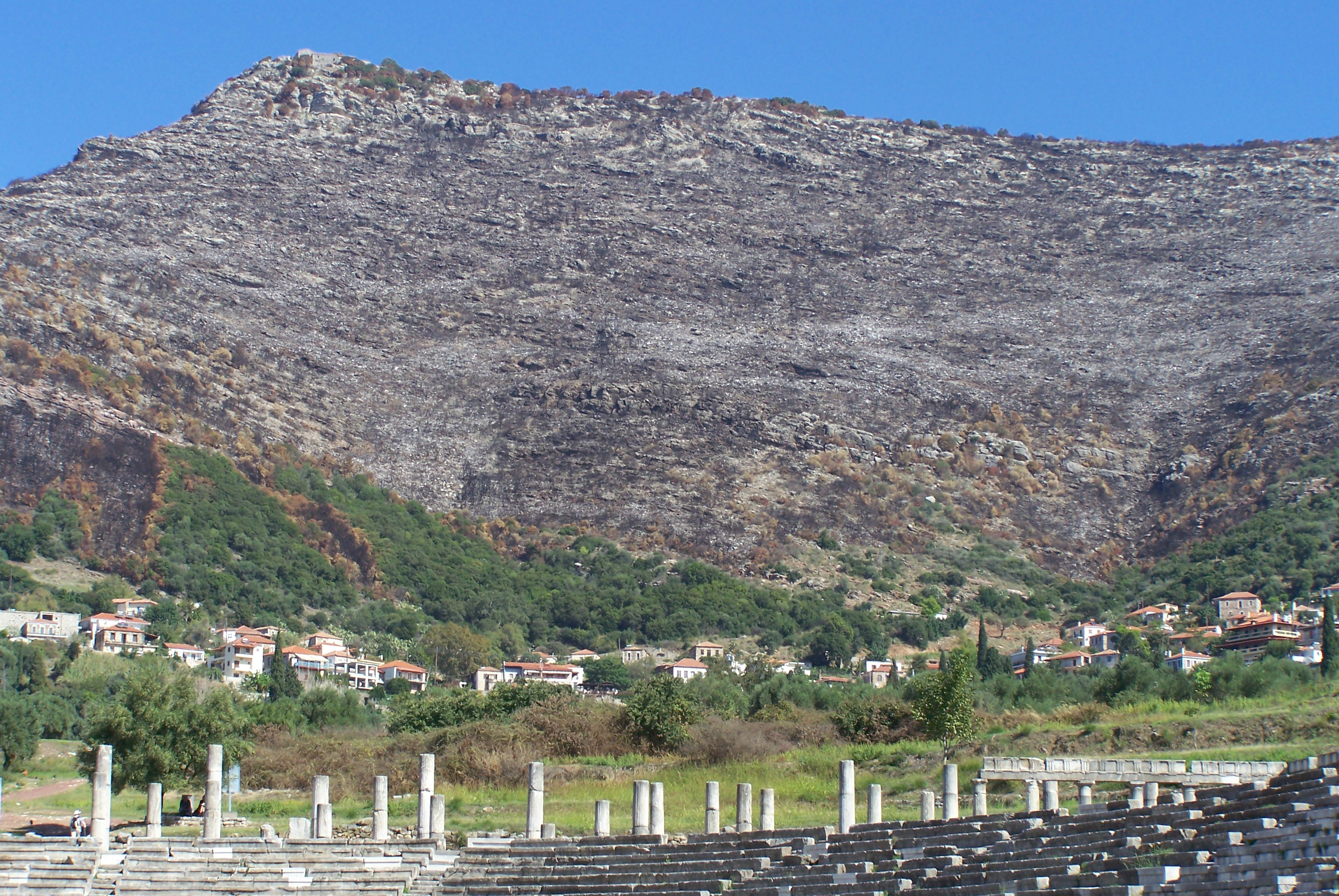 The second photograph was taken from Ancient Messene and shows how Ithome Mountain was severely burnt during a fire in August 2014.