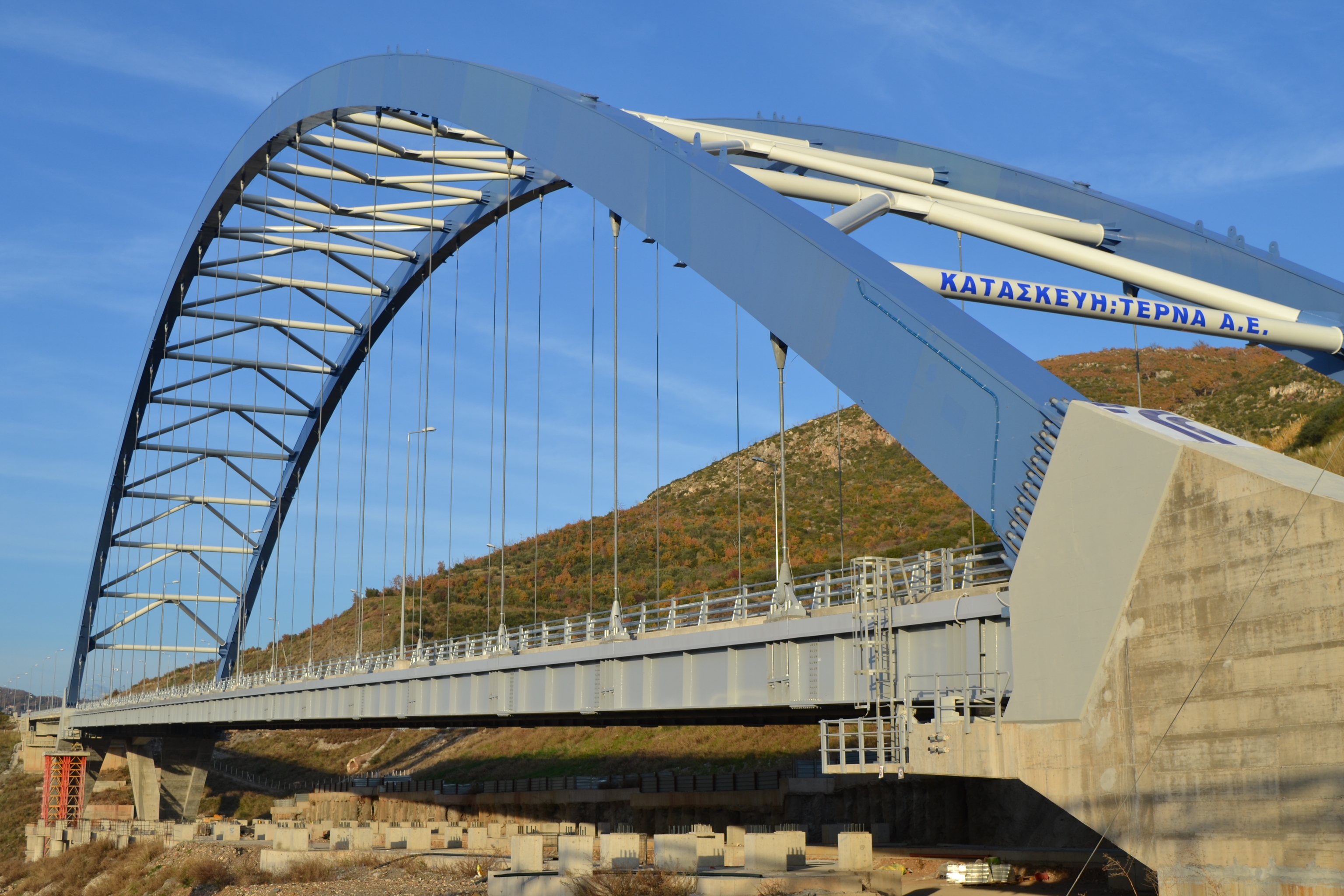 The deck consists of four lanes, two in each direction with a central traffic island. The arched structure, which is a major novelty for Greece, consists of two parabolic arcs connected together with wind bracing elements.